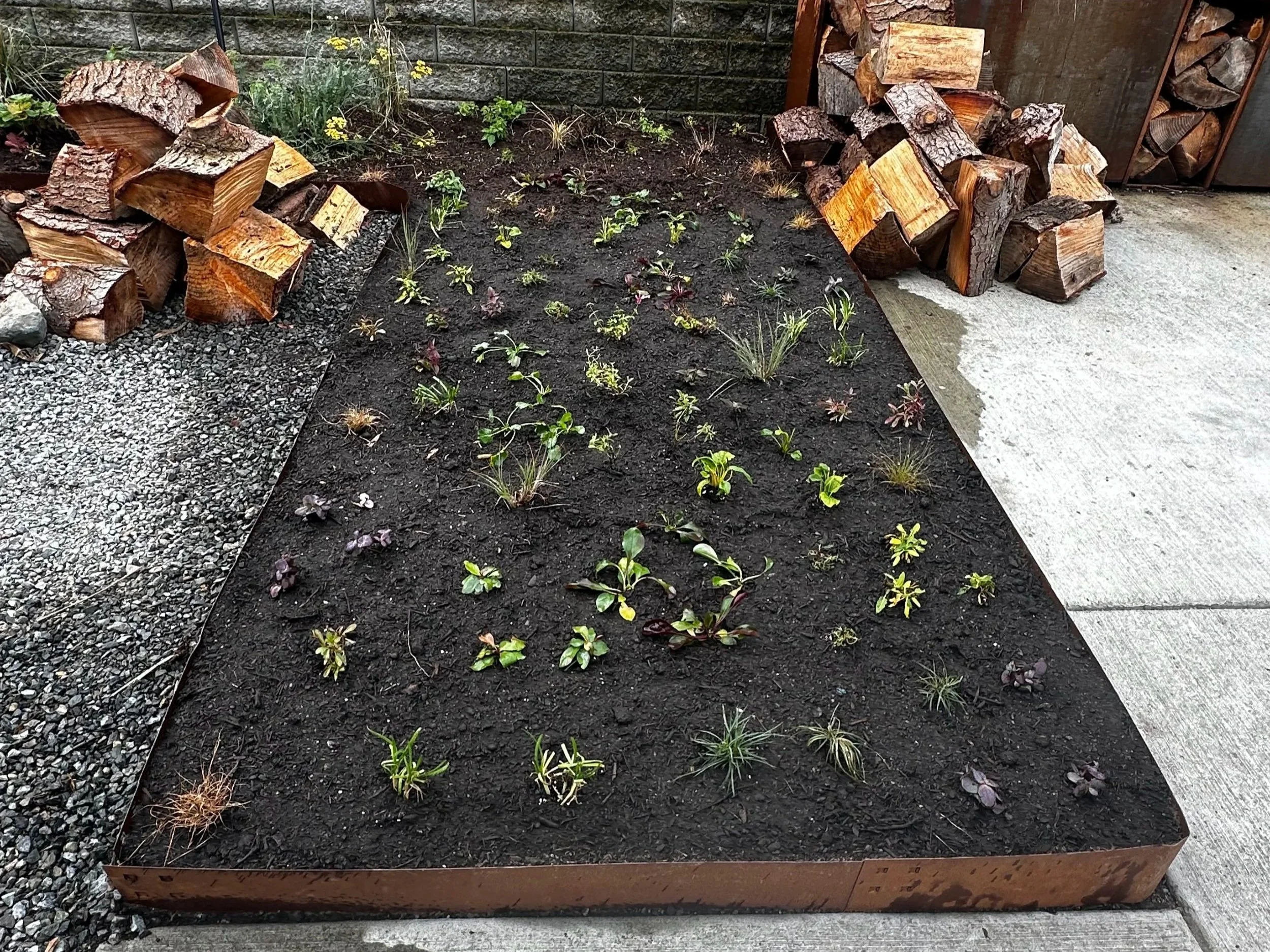 Fill your new steel-edged "container" with high-quality garden soil or a 50/50 compost blend right to the top of the edging. You need enough dirt to slot in your gallon size plants - so make sure to compact the soil down so it doesn’t sink. If you are using 4 inches or plugs, you will be fine, but no one likes the sunken garden bed look- fill the dirt to the brim of your Corten steel and walk all over it and keep filling until it’s compacted at the very top of the edging.